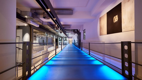 La sua struttura post-industriale è stata reinterpretata con finiture eleganti e high-tech, mescolando materiali grezzi come legno, marmo, cristallo e acciaio in un'estetica sorprendentemente moderna.